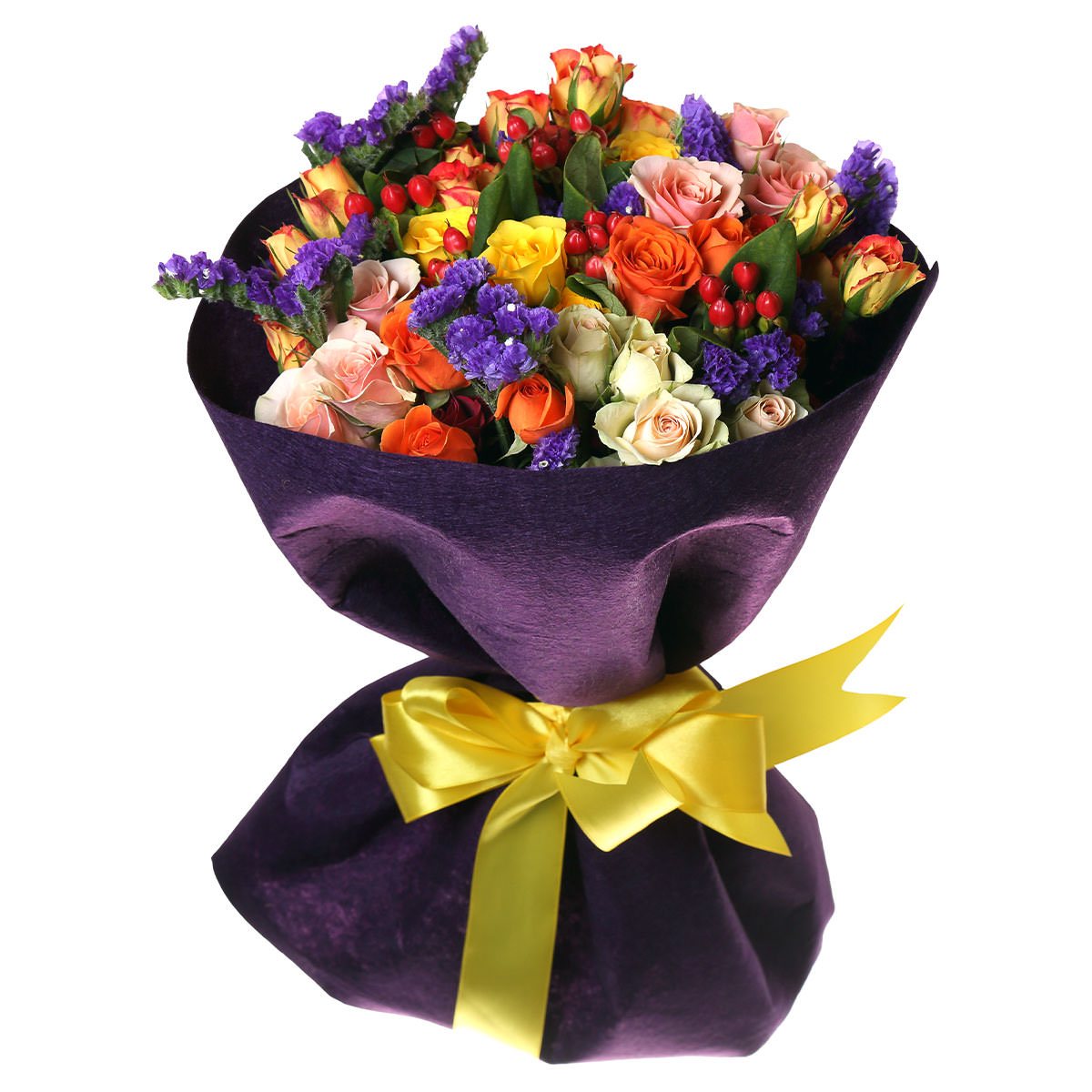 Роза кустовая оранжевая, розовая, кремовая, статица фиолетовая, гиперикум. Упаковка (лента, пленка, крафт, сетка, пленка матовая)
