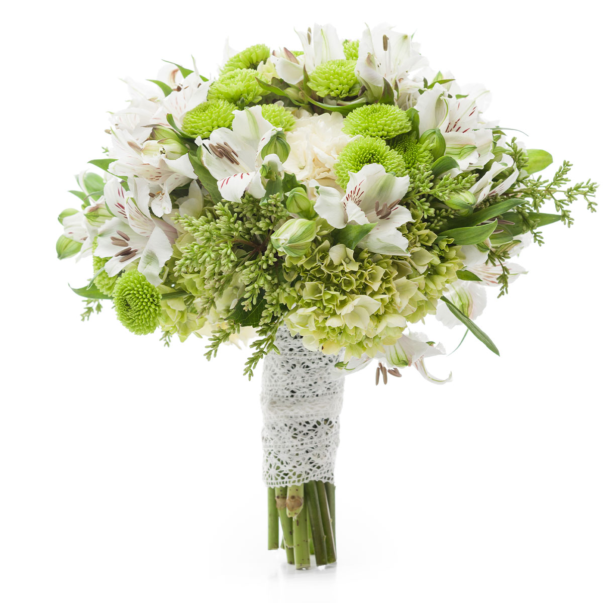 Альстромерия белая, гортензия зеленая, хризантема зеленая, зелень. Упаковка (лента, пленка, крафт, сетка, пленка матовая)