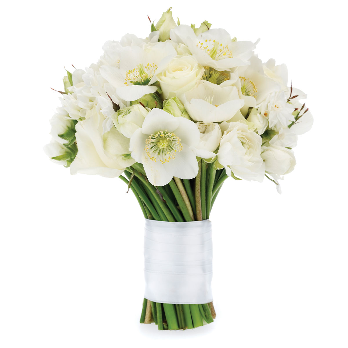Роза одноголовая белая, морозник белый. Упаковка (лента, пленка, крафт, сетка, пленка матовая)