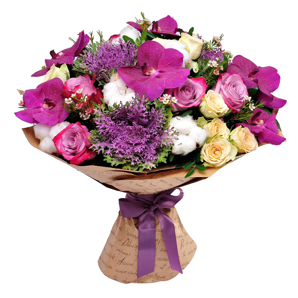 | Состав | Кустовые розы, Орхидеи, Розы, Хлопок |