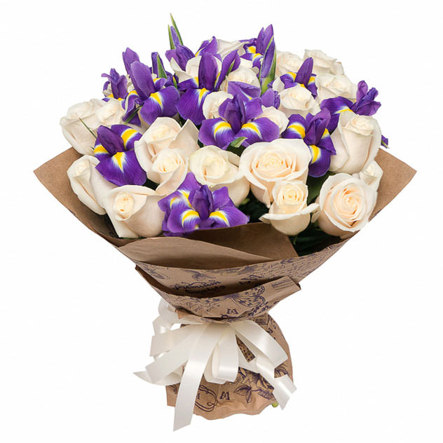 Ирис, роза одноголовая белая. Упаковка (лента, пленка, крафт, сетка, пленка матовая)
