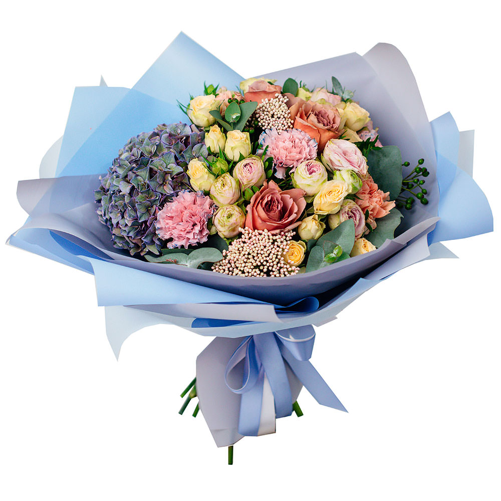 Гортензия синяя, роза кустовая кремовая, роза одноголовая розовая, гвоздика розовая, озотамнус, эвкалипт. Упаковка (лента, пленка, крафт, сетка, пленка матовая)