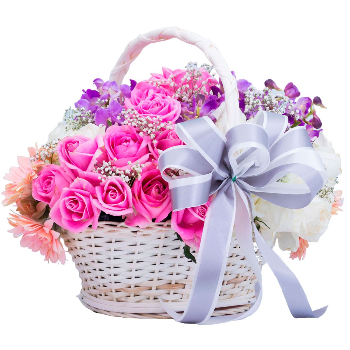 Роза одноголовая розовая и белая, орхидея сиреневая, гербера персиковая, гипсофила. Упаковка (Корзина, оазис, ящик).