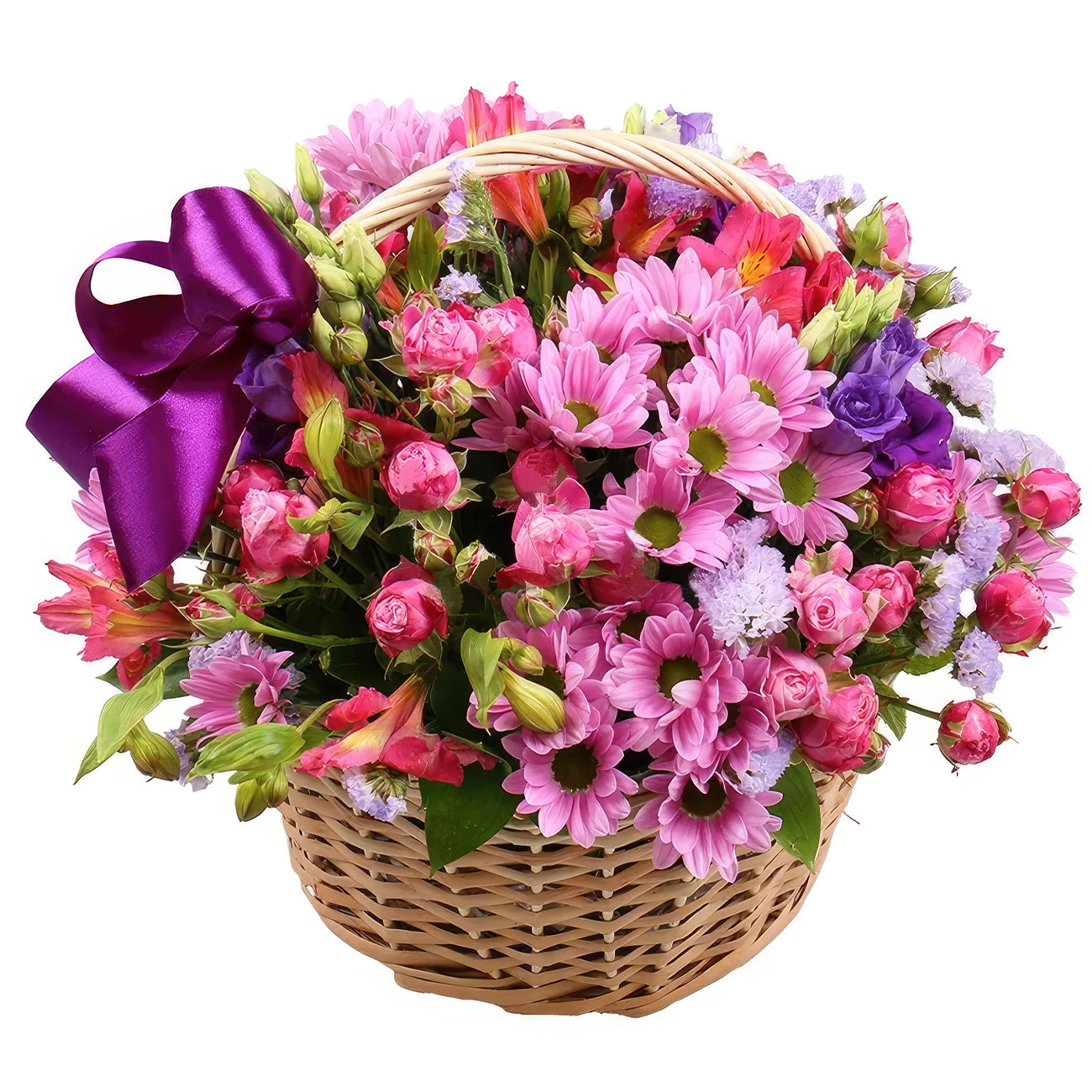 Хризантема кустовая розовая, альстромерия розовая, эустома фиолетовая, роза кустовая розовая, статица. Упаковка (Корзина, оазис, ящик).