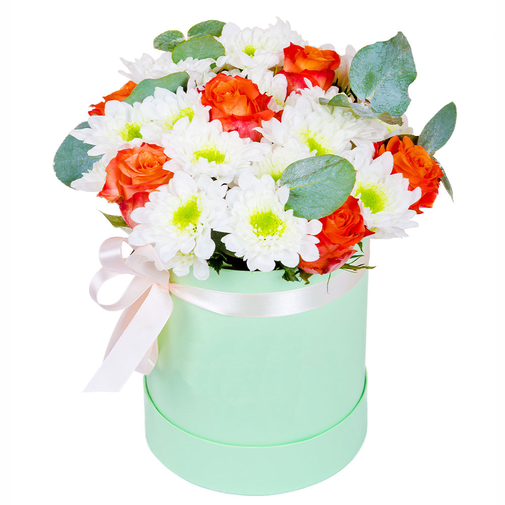Хризантема кустовая белая, роза одноголовая красная, эвкалипт. Упаковка (шляпная коробка, квадратный бокс, коробка сердце, оазис)
