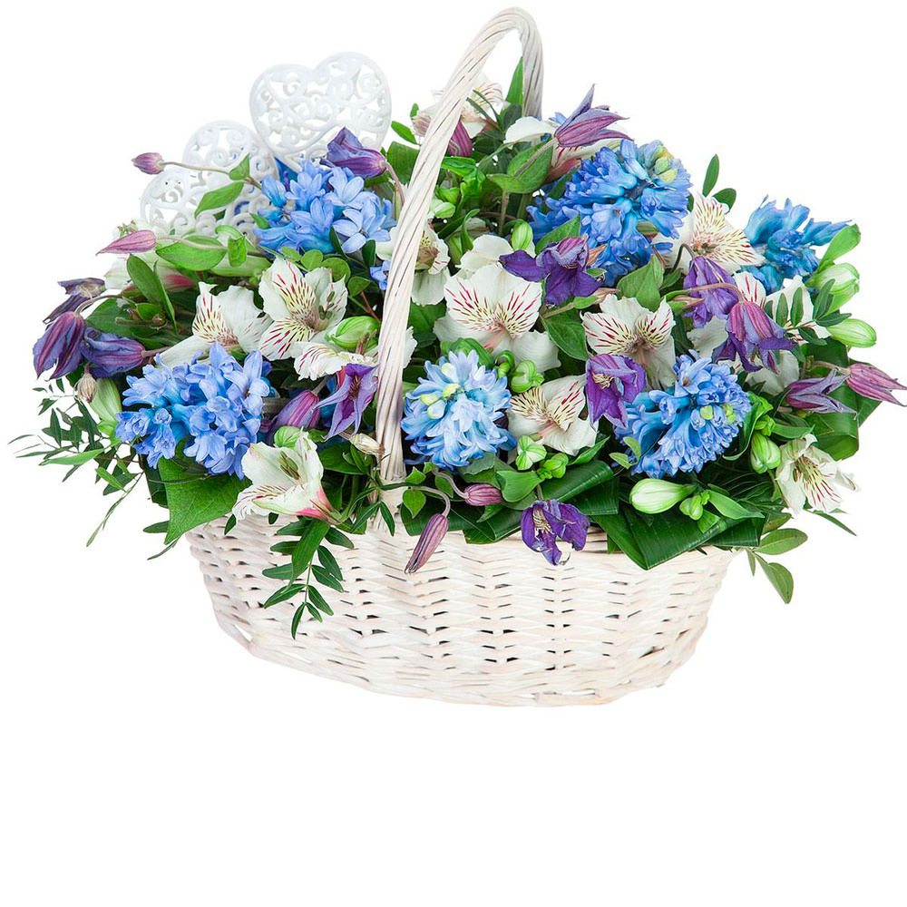 Гиацинт голубой, климатис фиолетовый, альстромерия белая, фисташка, аспидистра. Упаковка (Корзина, оазис).
